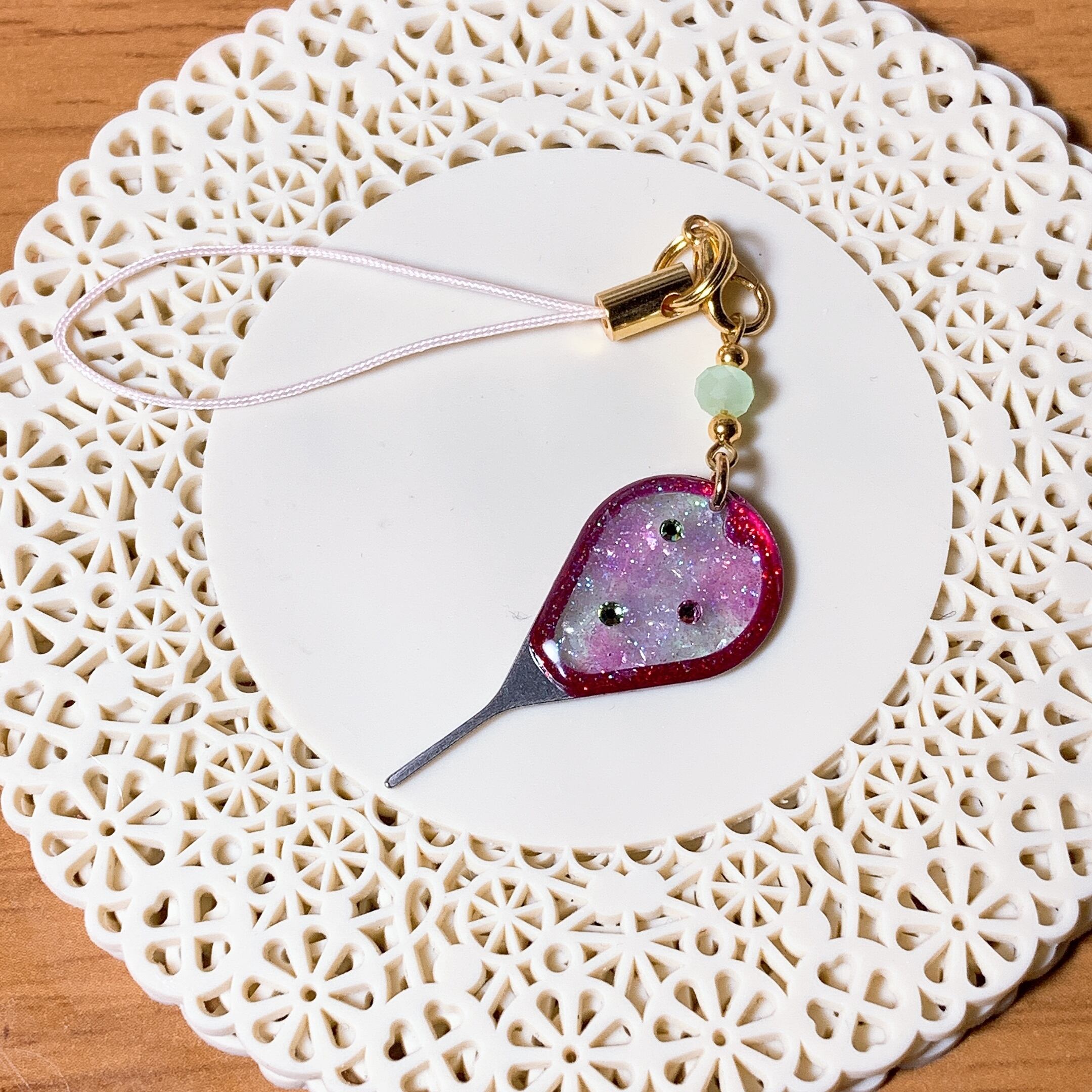 元々はただのシルバーの無機質なピンを素敵なストラップアクセサリーに変身させました❣️