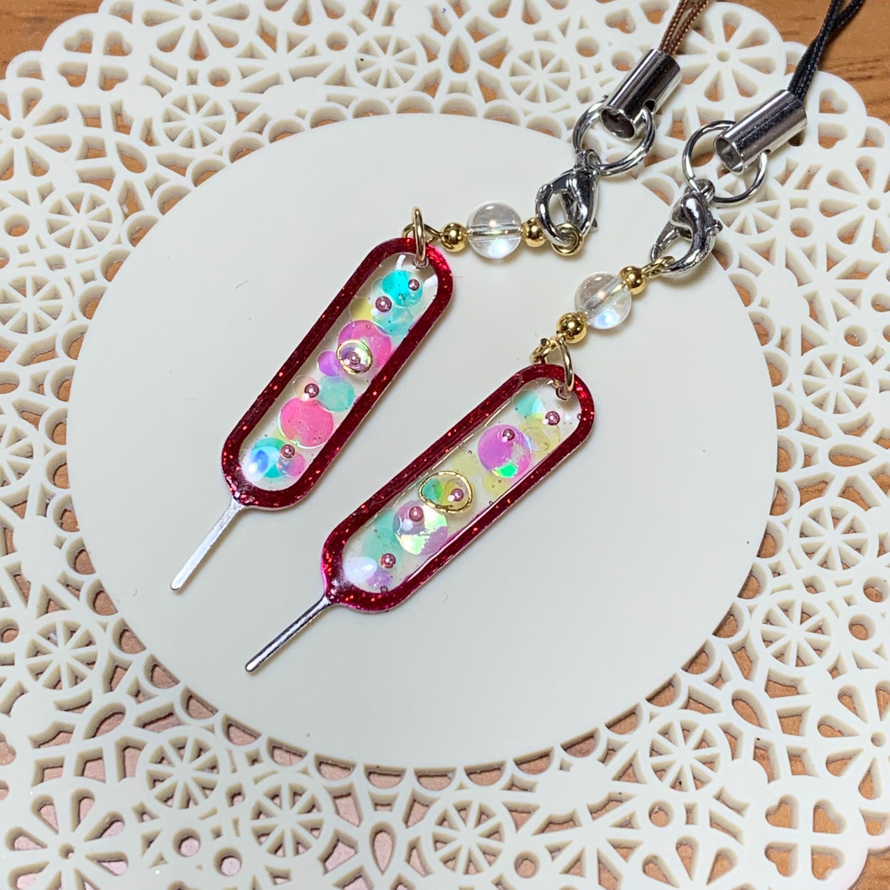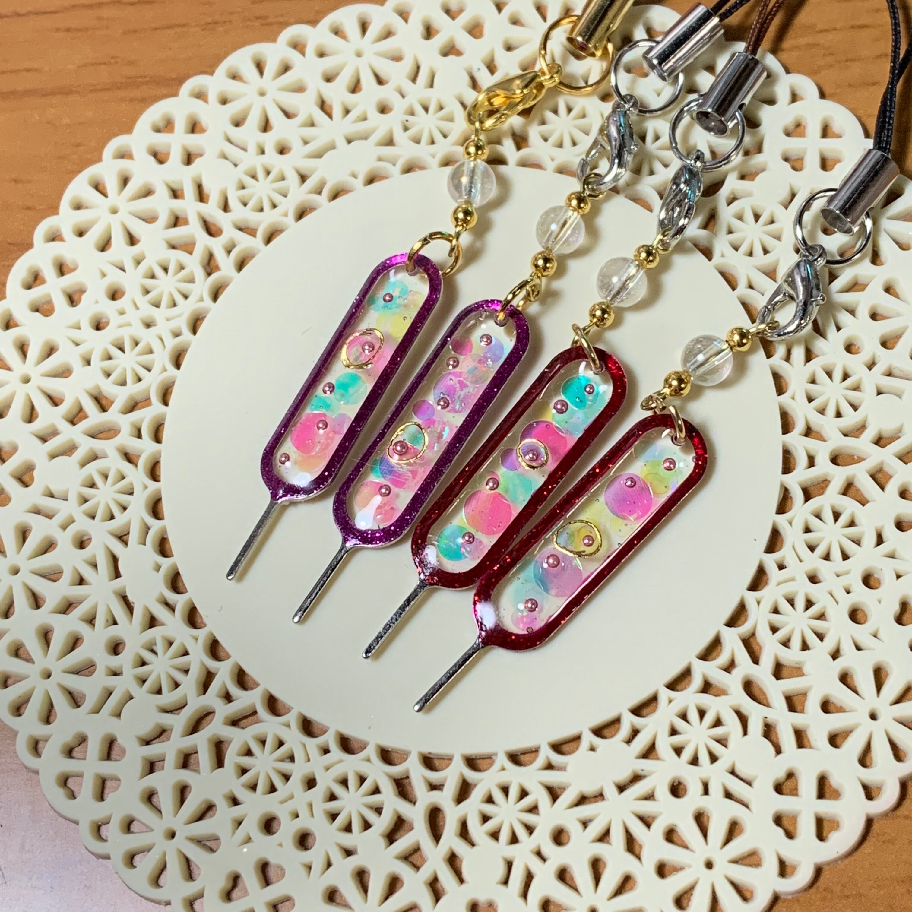 元々はただのシルバーの無機質なピンが、色を入れることにより素敵なストラップアクセサリーに変身。